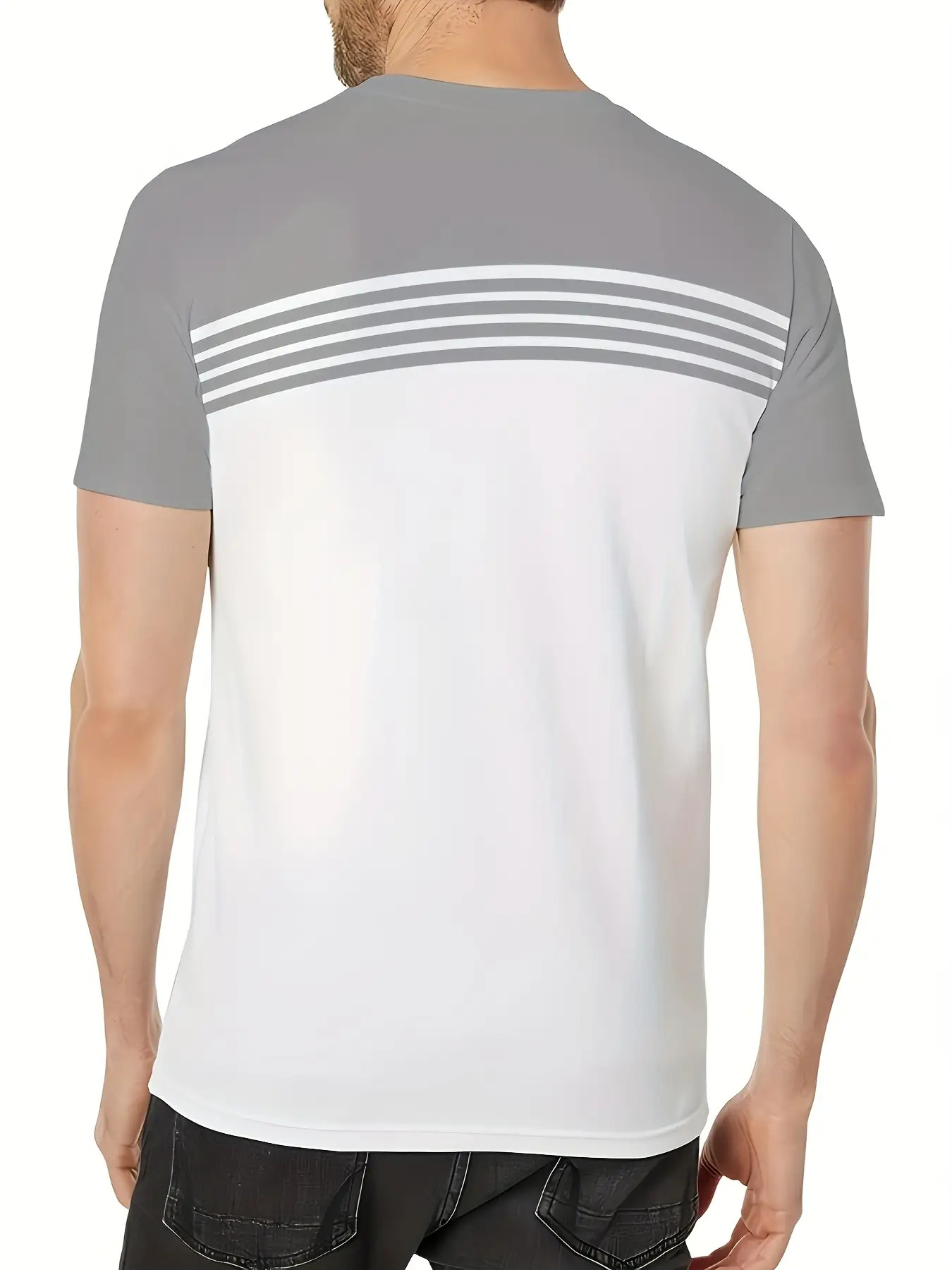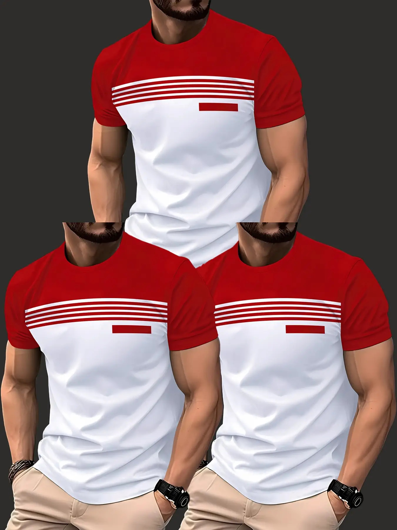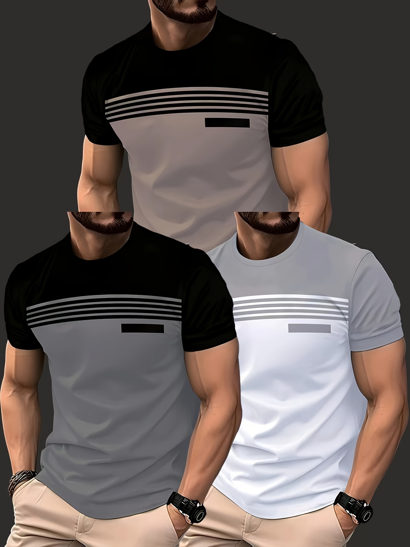 3pcs Men'S Casual Crew Neck Short Sleeve T-Shirts- Light Gray with White Horizontal Stripes, Regular Fit, Slight Stretch Fabric, Stylish Black Watch Accessories, Casual Attire|Striped Tee|Stretchy Fabric, Everyday Outfit, Versatile Clothing, Minimalist Design, Modern Casual, Durable Construction, Breathable Fabric, Basic Tee, Striped Shirt, Plus Size, Men T Shirt High Quality, Men Plus Size Clothing, Big And Tall Men Clothing, Men Big And Tall Clothing, Big And Tall Graphic Tee, Plus