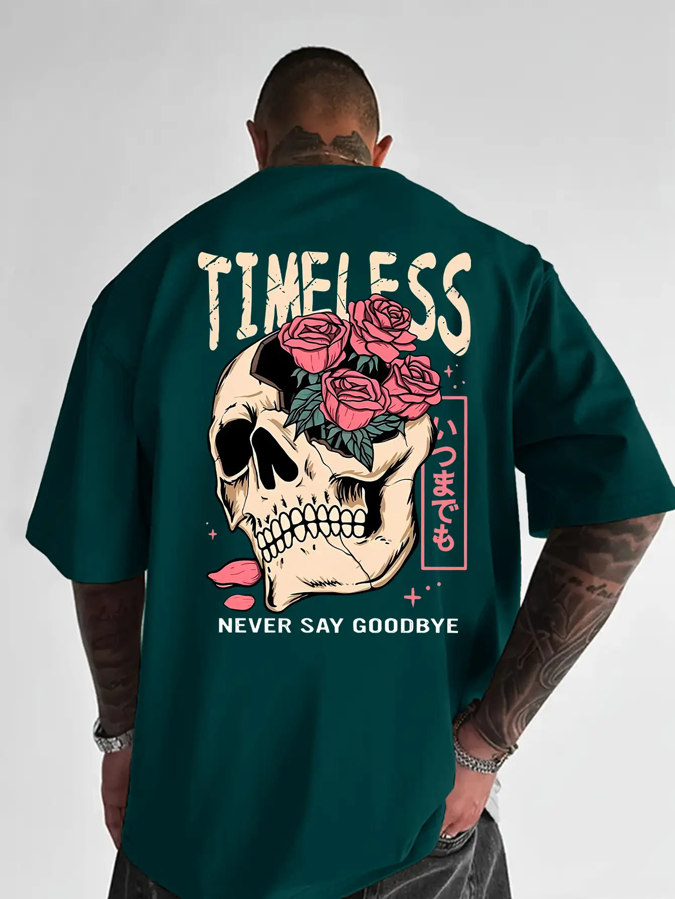 Men's Gothic Skull & Rose T-Shirt with Back Print - Oversized Streetwear Fit, Bold "TIMELESS" & Text Design, Heavy Metal Inspired Casual Shirt, Machine Washable (Big & Tall Sizes Available), PLUS SIZE
