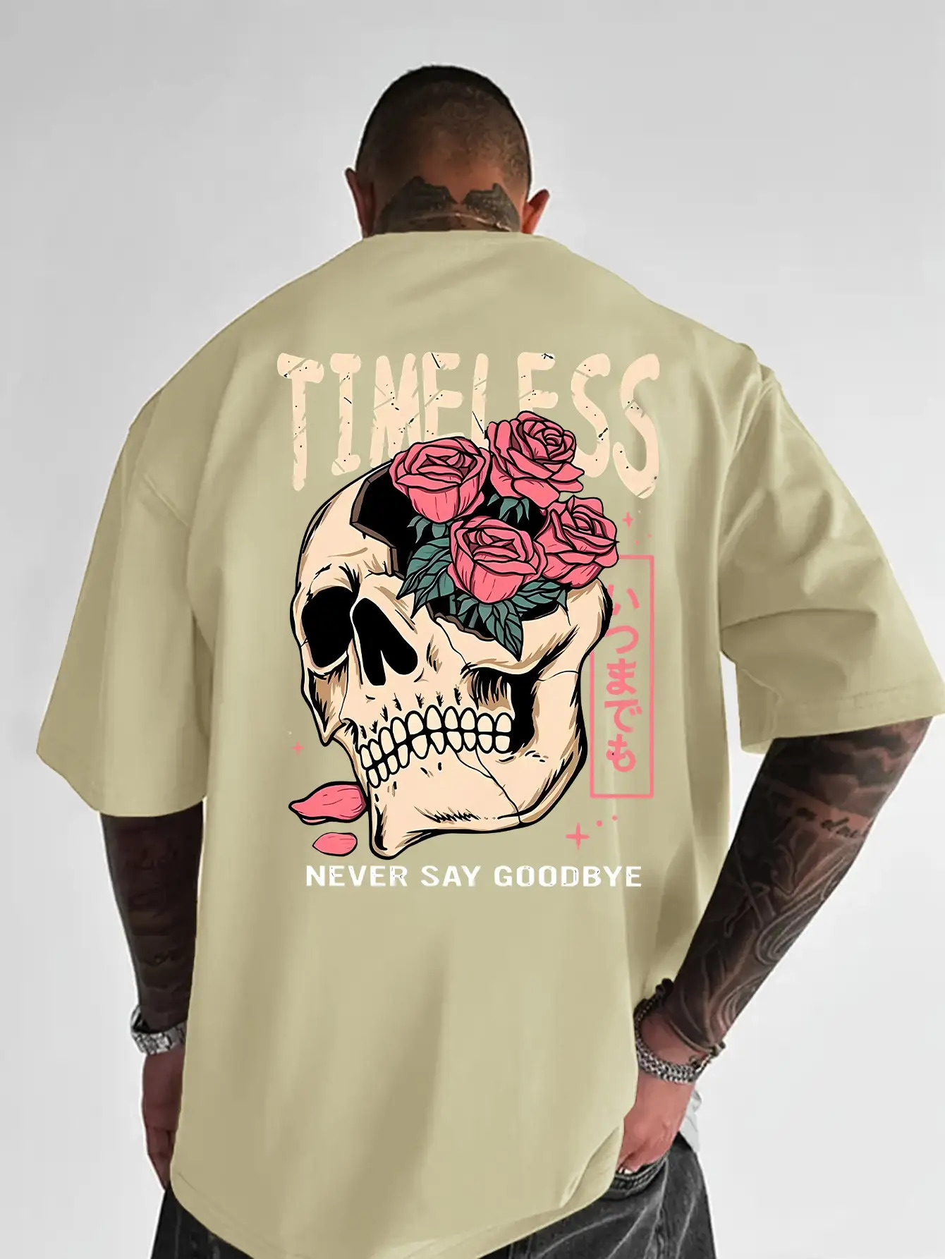 Men's Gothic Skull & Rose T-Shirt with Back Print - Oversized Streetwear Fit, Bold "TIMELESS" & Text Design, Heavy Metal Inspired Casual Shirt, Machine Washable (Big & Tall Sizes Available), PLUS SIZE