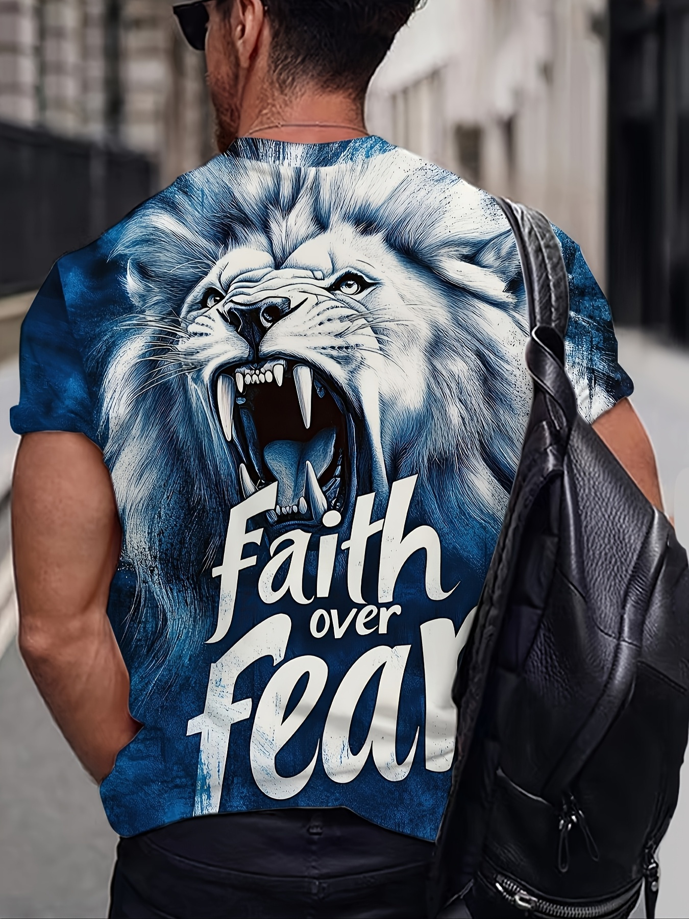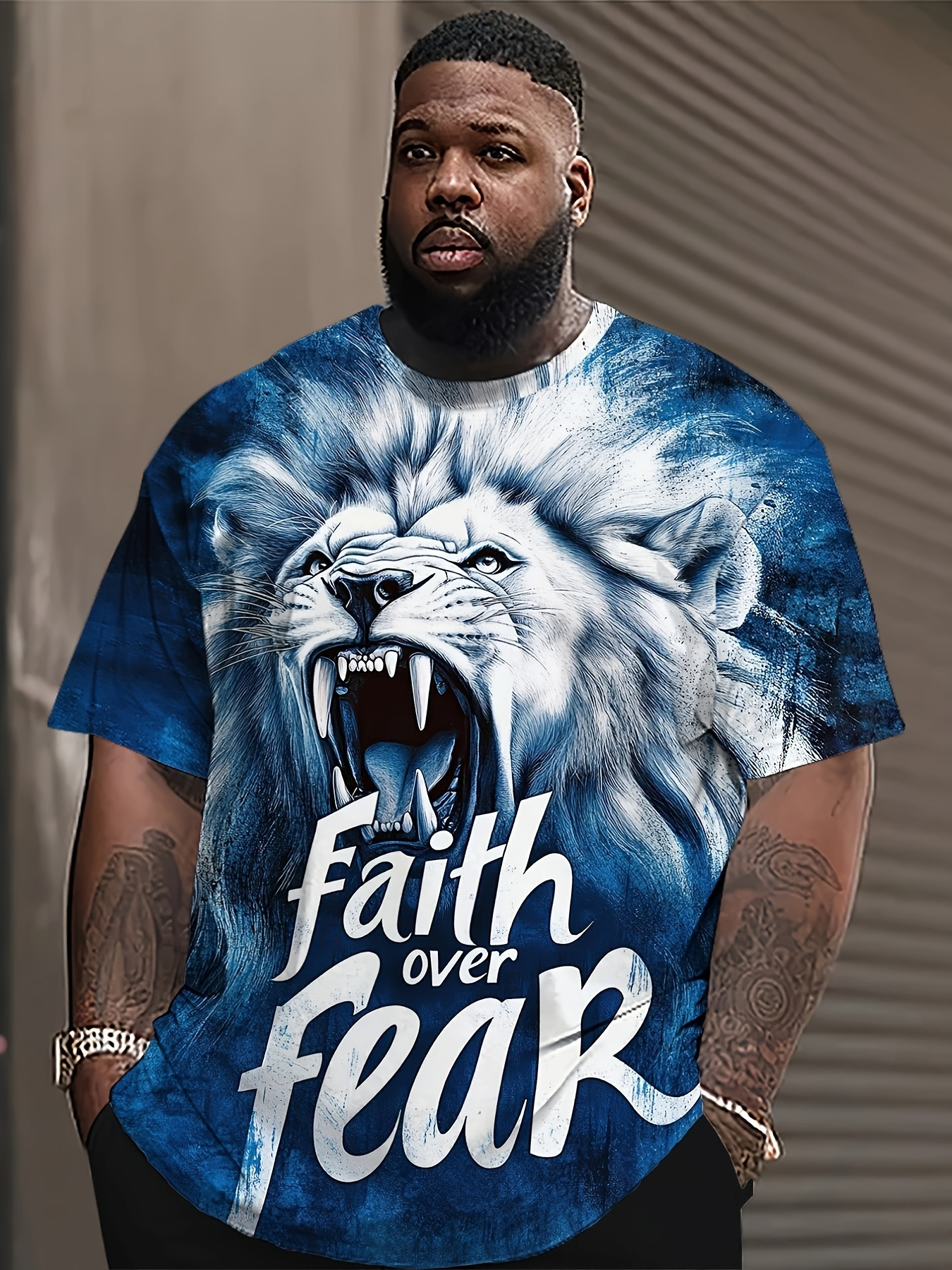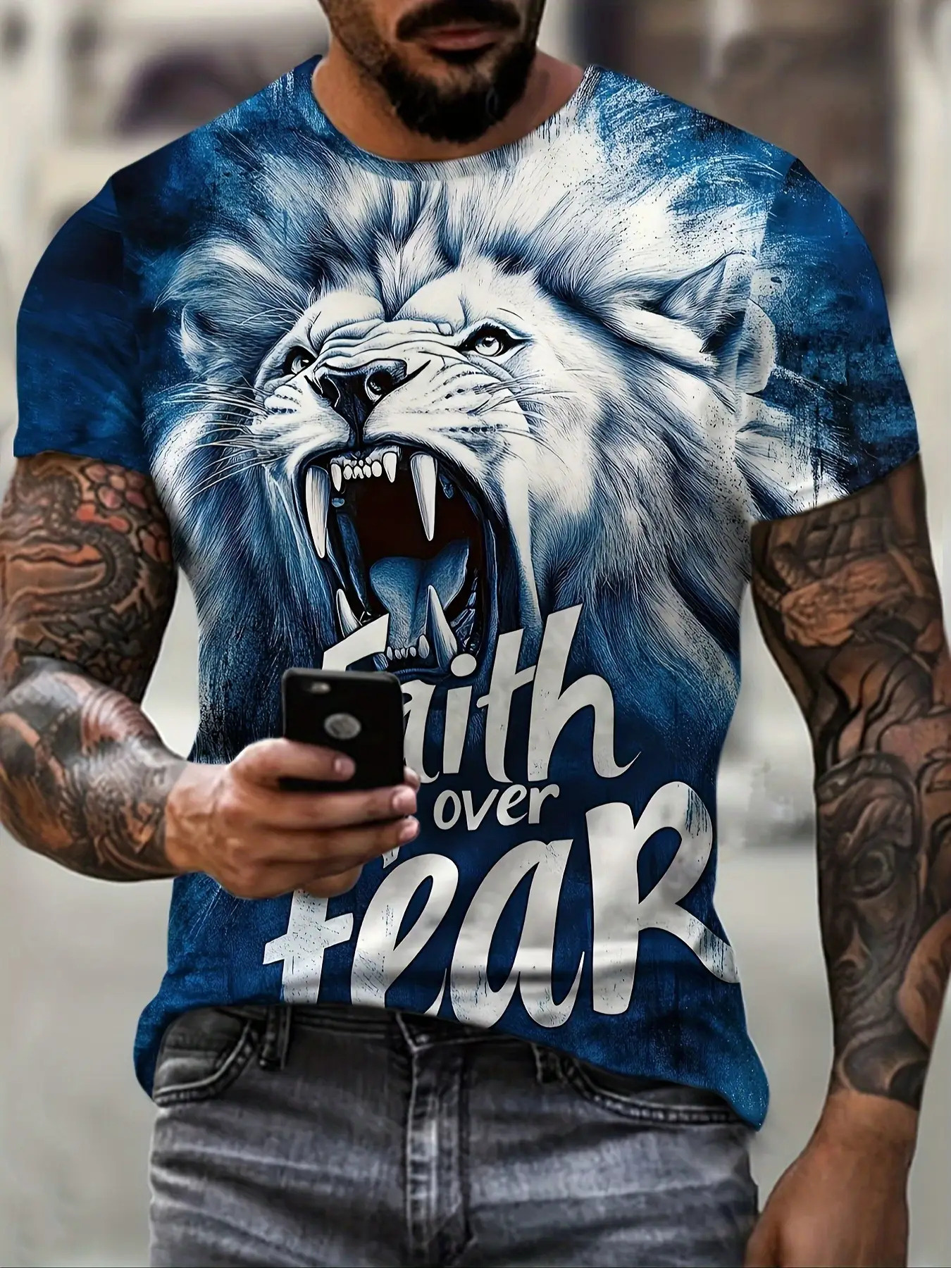 Men's Lion Face T-Shirt with Lion & 'Faith Over Fear' Slogan Print - Oversized Streetwear Tee, Plus Size Casual & Party Outfit, Comfortable Short Sleeve Shirt, Machine Washable White & Blue Lion Design, PLUS SIZE, Mens Trendy Shirts, Tshirt For Men, Mens Tshirt, T Shirt For Men Plus Size, Oversized T Shirt Men, Plus Size Mens T Shirt, Shirts For Men Plus Size, Plus Size Mens Clothing, Plus Size Men Clothing, Mens Shirts, Mens Tshirts, Mens Plus Size Shirt, Fathers Day Gift,
