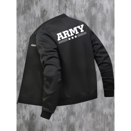 Men'S Plus Size Casual Army Print Varsity Jacket with Pockets, Baseball Collar, Zipper Closure, Knit Polyester Fabric, Slight Stretch, Regular Fit - 95% Polyester, 5% Elastane