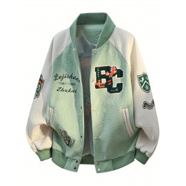 Men'S Large Size Casual Baseball Jacket with Letter Print & Team Spirit Design - Warm Outerwear, Snap Closure & Functional Pockets, Spring/Fall Outdoor Sports Apparel, Christmas Gift for Men (No Hat Included) - Trendy Casual Style for Casual Attire