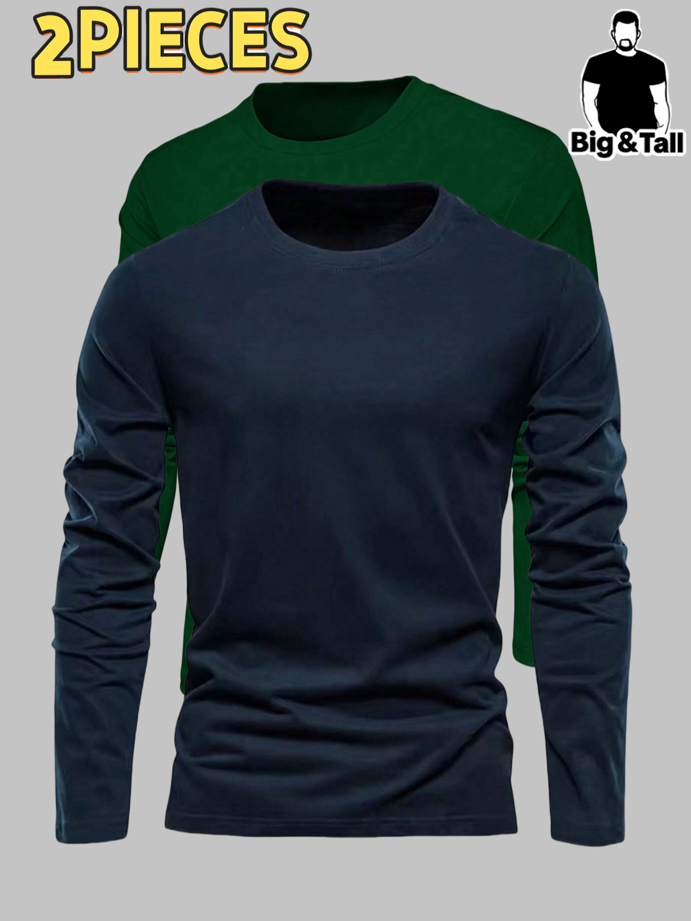 2pcs Men's Heavyweight 95% Polyester/5% Spandex Oversized Long Sleeve T-Shirt Set - Soft Stretch Round Neck Casual Layering Shirts in Green & Grey, Solid Color Winter Warmth, Comfortable Casual Attire, Plus Size Available (Machine Washable) - Ideal for Fall & Winter Layering Essentials (Casual & Formal Outfits) - Versatile Matching Outfits for Men, Relaxed Fit, Durable & Easy Care, Long Sleeve T Shirts for Men, Mens Plus Size T Shirt, Printed T Shirts for Men, PLUS SIZE