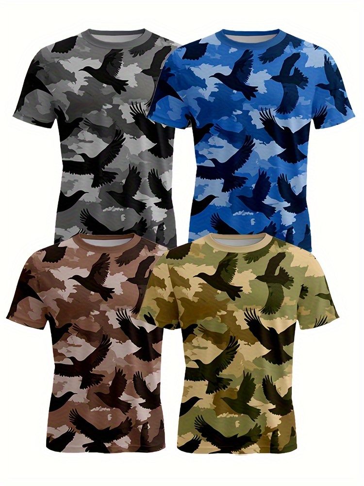 4pcs Men'S Camo Tactical T-Shirts - Breathable Polyester, Crew Neck, Short Sleeve, Casual Sports Knit Fabric, Slight Stretch, Regular Fit for Spring/Summer Outdoor Activities, PLUS SIZE