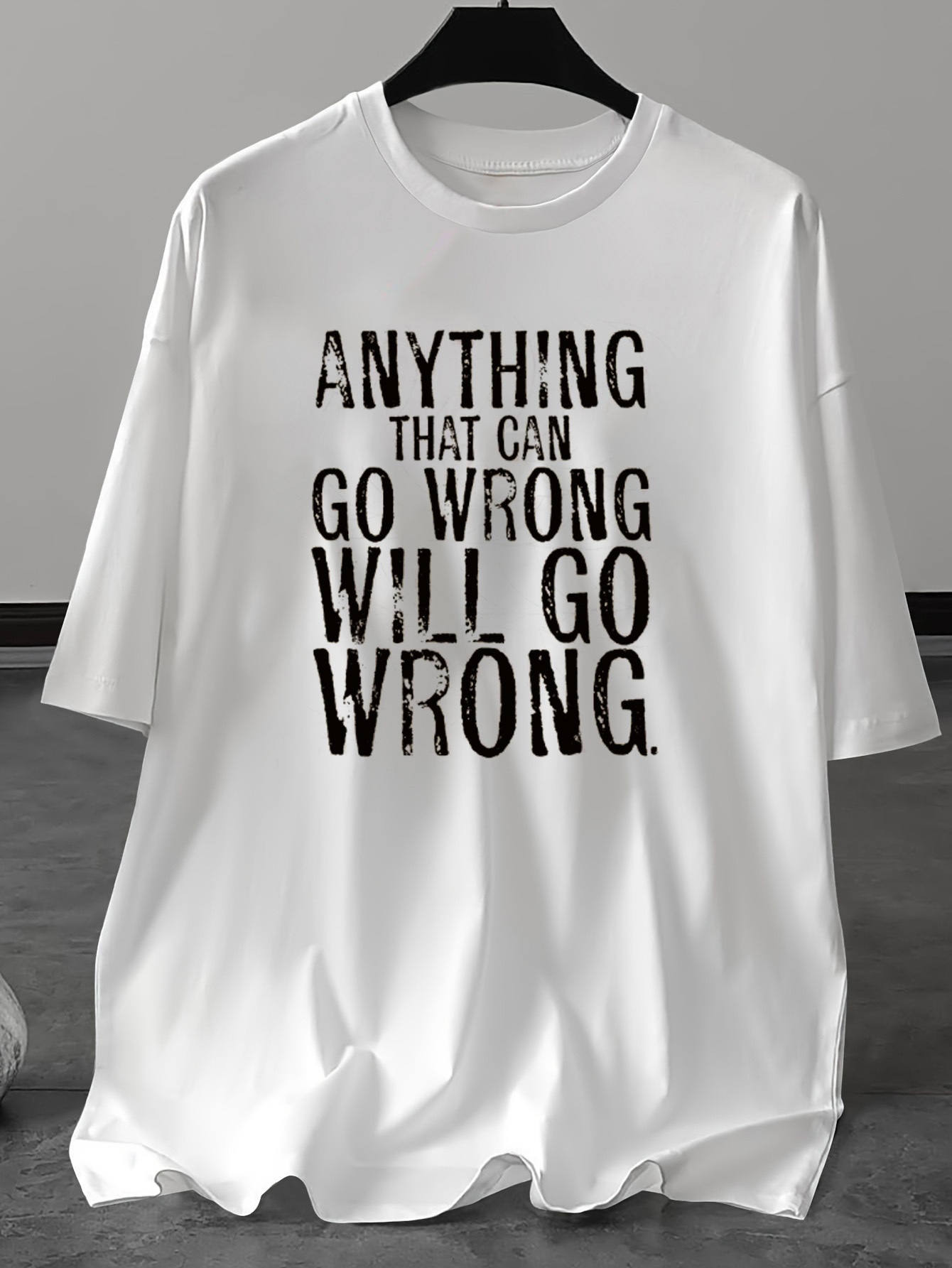 Plus Size Men'S Short Sleeve T-Shirt with Street Style, Vintage Distressed Murphy'S Law Slogan "ANYTHING THAT CAN GO WRONG WILL GO WRONG" Print, Soft and Comfortable Fabric for Couples' Outings & Casual Attire, PLUS SIZE